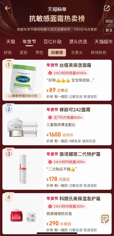 而在功效护肤领域,高德美拥有丝塔芙Cetaphi和阿莱丝汀Alastin两大品牌,在天猫旗舰店,丝塔芙大白罐(丝塔芙舒润保湿霜)显示已售100万+,居天猫抗敏感面霜热卖榜第一名。