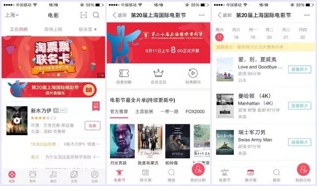 在“淘票票”内,选中心仪的场次,可添加进观影日程,观影日程会根据场次的时间、影院位置、交通状态自动提醒用户,帮助用户快速做好观影安排;如果用户添加的场次发生变更,观影日程也会第一时间通知用户。正式开票时,用户可直接通过这一功能,顺利购买心仪影片票券。
