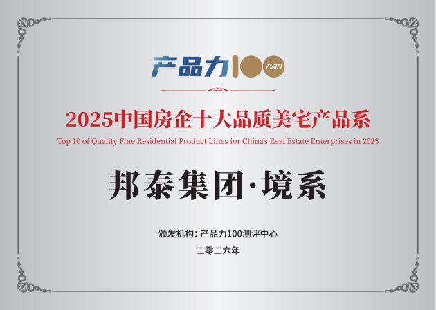 1月8日,克而瑞地产研究主办的“为更好 启新篇”——2025年中国房地产企业产品力TOP100发布会在上海隆重召开。邦泰境系产品获评“2025全国房企十大品质美宅产品系”、南宁邦泰·璟和上榜“2025年度中国好房子作品TOP20”。