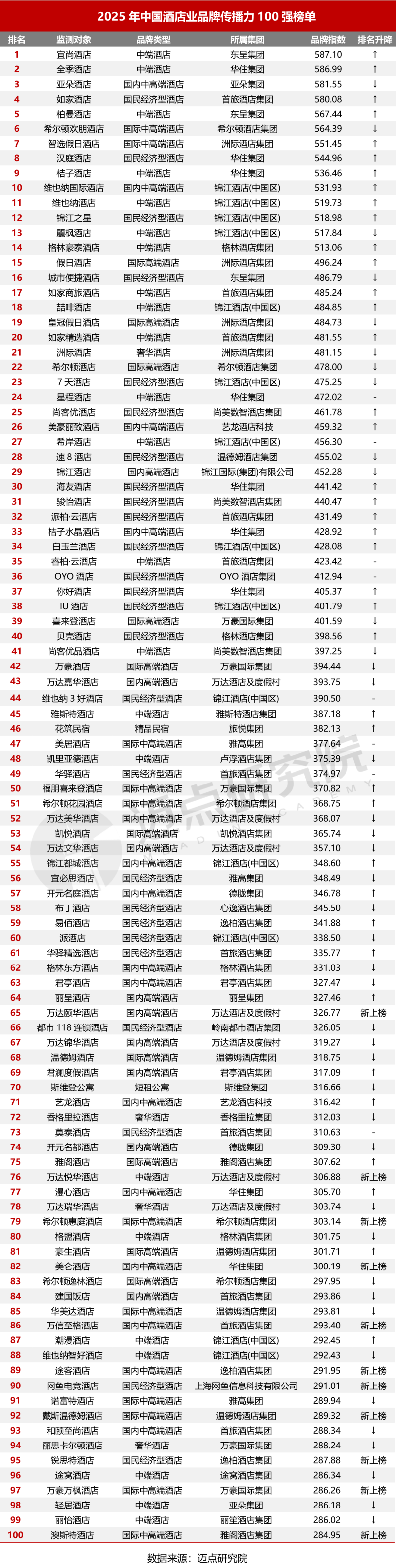 2025年中国酒店业迈入深度调整与品质升级并行的关键阶段,存量优化与结构分化成为行业发展核心脉络。近日,迈点研究院独家发布“2025年中国酒店业品牌传播力100强榜单”,以权威数据勾勒行业全景——宜尚酒店、全季酒店、亚朵酒店领跑百强,11个新晋品牌中7成聚焦中高端赛道,印证了消费升级下品质化需求的强劲势能。从区域布局到主题创新,从收并购热潮到数智化渗透,榜单及数据不仅呈现了品牌竞争的新格局,更揭示了行业从规模扩张向质效提升转型的深层逻辑,为从业者把握趋势、精准布局提供了重要参考。