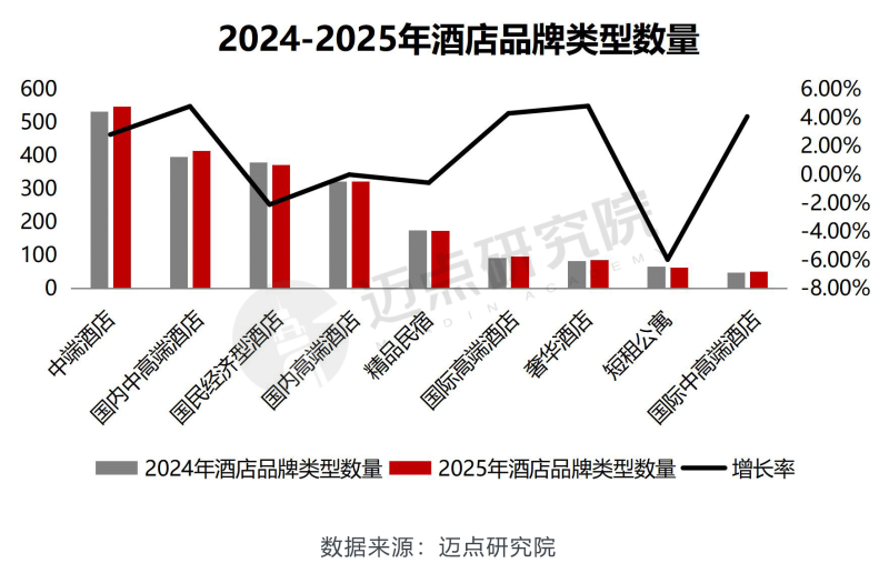 2025年,据迈点研究院大数据统计,不同类型酒店品牌数量增长1.48%,增速持续放缓,行业持续优化结构,品牌出清进程持续推进。从数量占比上来看,中端及中高端酒店已占据品牌数量的核心份额,占比接近50%。从数量增长率来看,奢华酒店、国内中高端酒店和国际高端酒店品牌数量增速最高。具体表现为奢华酒店(4.82%)、国内中高端酒店(4.80%)、国际高端酒店(4.30%)。2025年,随着消费升级趋势持续深化,高净值人群对高品质服务的付费意愿不断提升,有力支撑了中高端及奢华酒店品牌数量的稳步增长。聚焦中端及中高端赛道、具备精细化运营能力与体验感营造优势的头部品牌,将持续引领行业变革,进一步强化核心赛道的品牌竞争力,推动酒店业从单一住宿功能向多元化生活方式体验载体转型,为整个行业的高质量发展注入新活力。