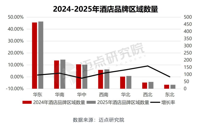 2025年,据迈点研究院大数据统计,区域板块酒店品牌数量增长2.14%。从数量占比上来看,华东地区继续保持领先优势,本年度占比已高达41.3%,超过其他区域。这与华东地区经济活力强劲、旅游消费市场成熟密切相关;从数量增长率来看,2025年酒店品牌的区域发展呈现显著分化特征。西北、华北区域表现最为亮眼,品牌数量增长率分别达9.09%、5.88%,尤其是西北地区,酒店品牌数量增长率持续提升,连续三年保持区域增长率第一。这得益于西北地区文旅资源开发深化与基础设施完善,叠加政策赋能,成为酒店品牌布局的新兴增量市场;华南与西南区域同步实现3.03%的增长,依托自身文旅资源禀赋与商业活力,持续吸引品牌落地;而华中区域出现1.17%的小幅下滑,东北区域则维持持平状态。反映这些区域仍面临连锁化率偏低、季节依赖明显等问题,品牌扩张动力不足。