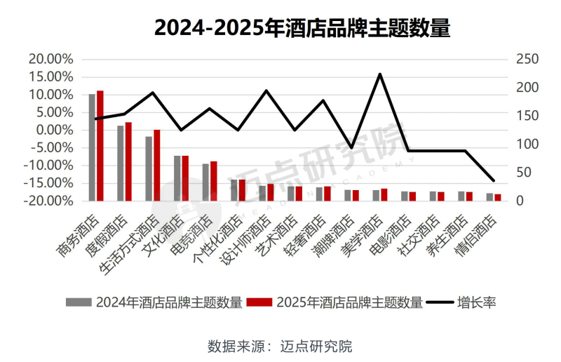 主题酒店市场方面,伴随消费升级深化与文旅融合提速,消费者对个性化、体验化住宿的需求持续迭代。2024-2025年主题板块酒店品牌数量保持增长态势,从各类主题酒店数量占比来看,传统核心主题仍占据主导地位,其中商务酒店(23.49%)、度假酒店(16.73%)、生活方式酒店(15.16%)占比位居前三,其余主题占比均低于10%;从数量增长率来看,美学酒店(15.79%)、设计师酒店(11.11%)、生活方式酒店(10.53%)三大类主题认可度显著提升,成为市场增长主力。这一格局变化核心源于消费需求的精准迭代:美学酒店、生活方式酒店凭借多元场景营造与情感价值输出,精准匹配年轻消费群体对个性化生活体验的追求;设计师酒店通过风格升级与审美创新,扭转实现逆势增长。