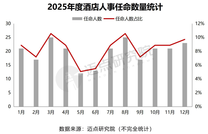 2025年酒店行业人事任命呈现“两头高、中间低”的季节性分布,3月与8月为全年高峰,5月与6月为低谷;整体与行业战略调整、市场周期及高管流动规律高度匹配,本土人才与女性高管崛起、数字化岗位增多成为显著趋势。