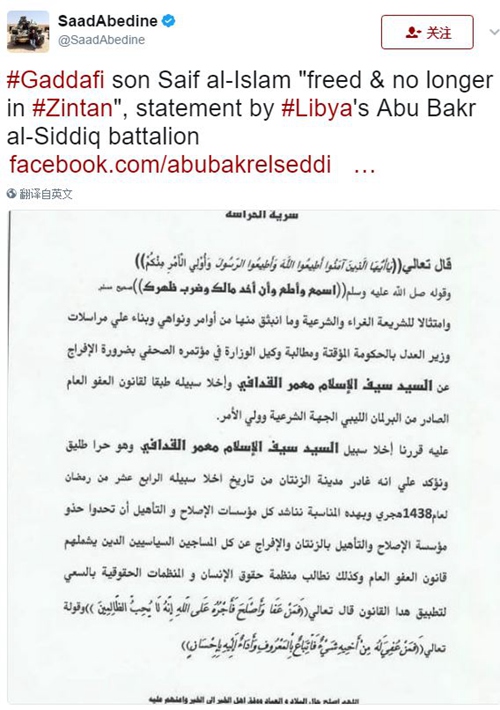 该武装发表声明称,赛义夫在“斋月的第14天”离开了津坦,最终决定释放他是依据东部政府议会在2015年通过的特赦法案。
