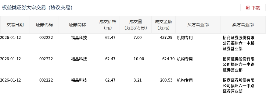 1月12日,福晶科技大宗交易成交20.21万股,成交额1262.52万元,占当日总成交额的0.36%,成交价62.47元,较市场收盘价72.12元折价13.38%。