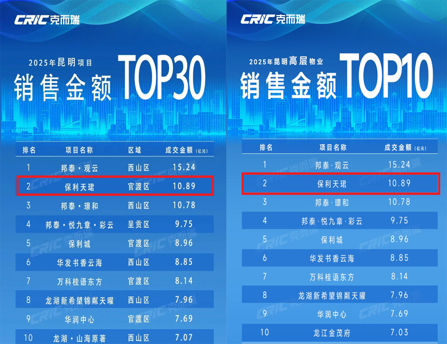 近日,克而瑞发布的《2025年昆明商品住宅项目销售金额TOP30》和《2025年昆明高层、洋房、别墅销售金额TOP10》相继出炉,保利天珺以10.89亿元均位列第二,蝉联官渡区豪宅销冠。