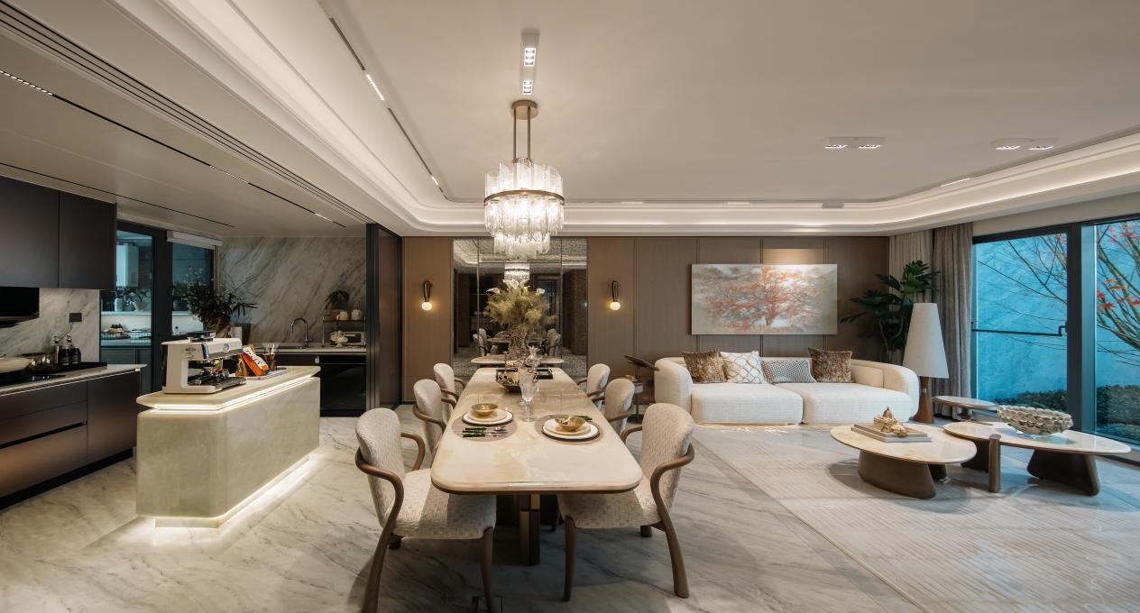 这里,将不只是一个放大的客厅,更是一个融合了观影厅、会客厅、餐饮区、书房和茶室五大功能的"家族关系场"。客+厨+餐LDK一体化无边界空间布局,可以是一场沙龙,是一场小型宴会,亦或是一个高含金量的小型交流会等。