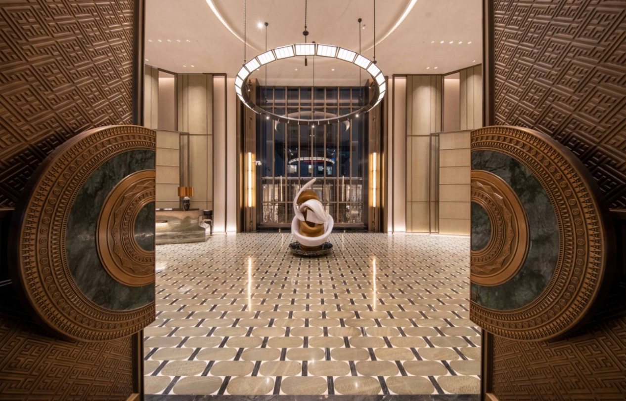 高达9米、宽达32米的专属定制铜制大门,中间镶嵌着碧玉,庄重且气势磅礴,入眼便是豪宅的气质和品位。