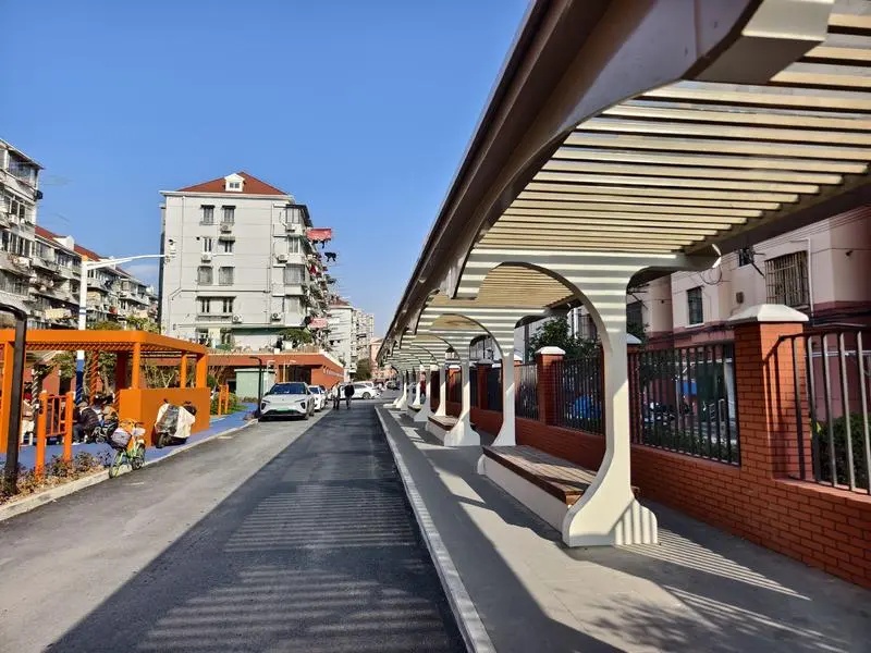 通道南侧的风雨连廊也是“五八通道”焕新改造的一个突出亮点。它不仅非常美观,还具有挡风遮雨和夏天为居民遮挡强烈阳光的功能,非常实用。根据人大代表对“五八通道”改造方案的建议,这条风雨连廊将来还将进一步提升,彰显“百年吴淞”厚重的人文底蕴,让居民不忘自己脚下这片土地的“乡愁”。