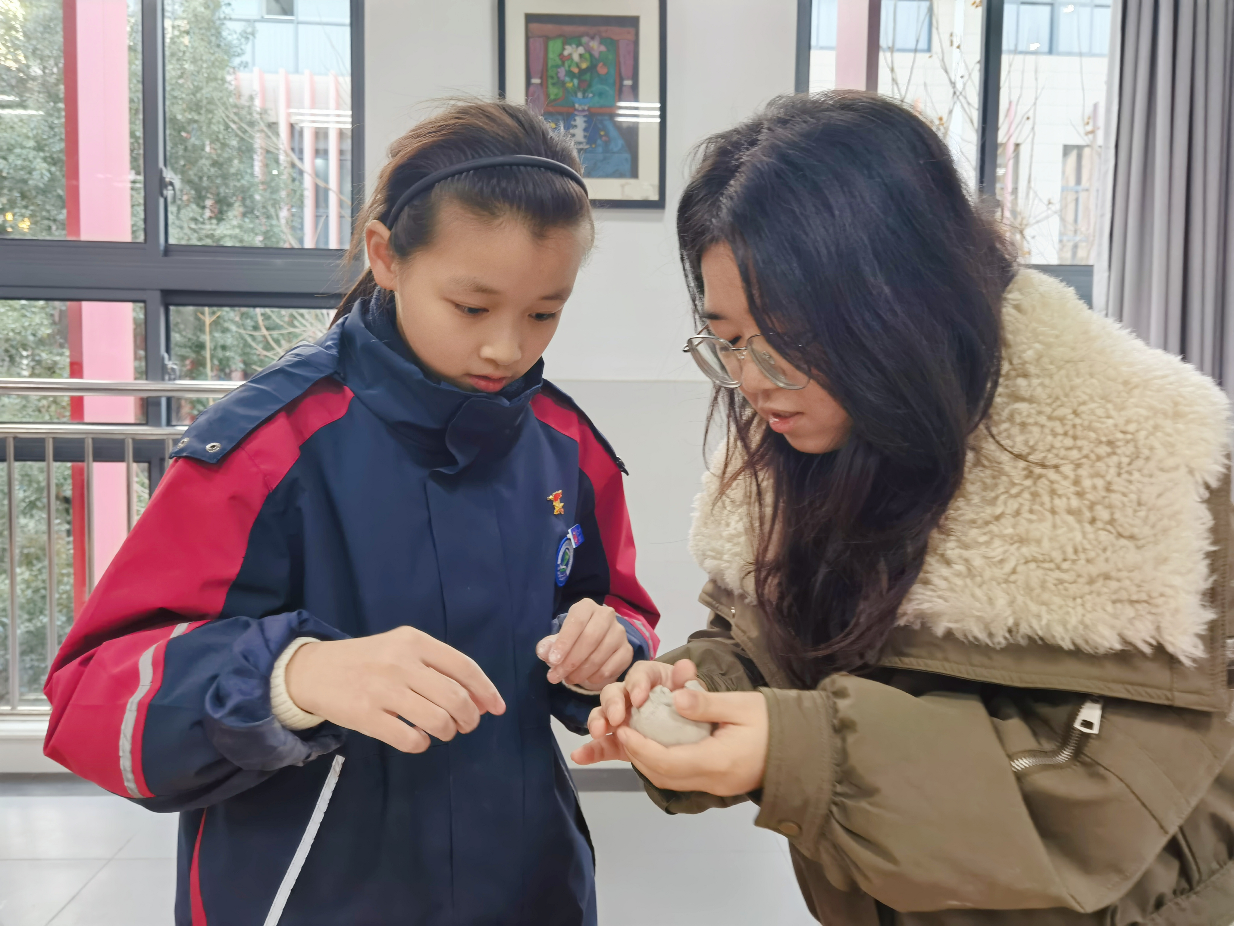 最让人期待的动手环节是亲手制作一只越窑青瓷的小马摆件。在大学生志愿者的一对一指导下,大家撸起袖子大展身手:揉泥排气、塑形粘黏,有的捏出奔腾的骏马,有的捏出呆萌的小马驹。“身体要塞纸团、打通气孔,不然烧的时候会炸裂……”“你可以让小马抬起前腿,看起来更有活力……”大学生们耐心示范技巧,及时解决同学们的创作难题,课堂上满是泥土香气与欢声笑语。