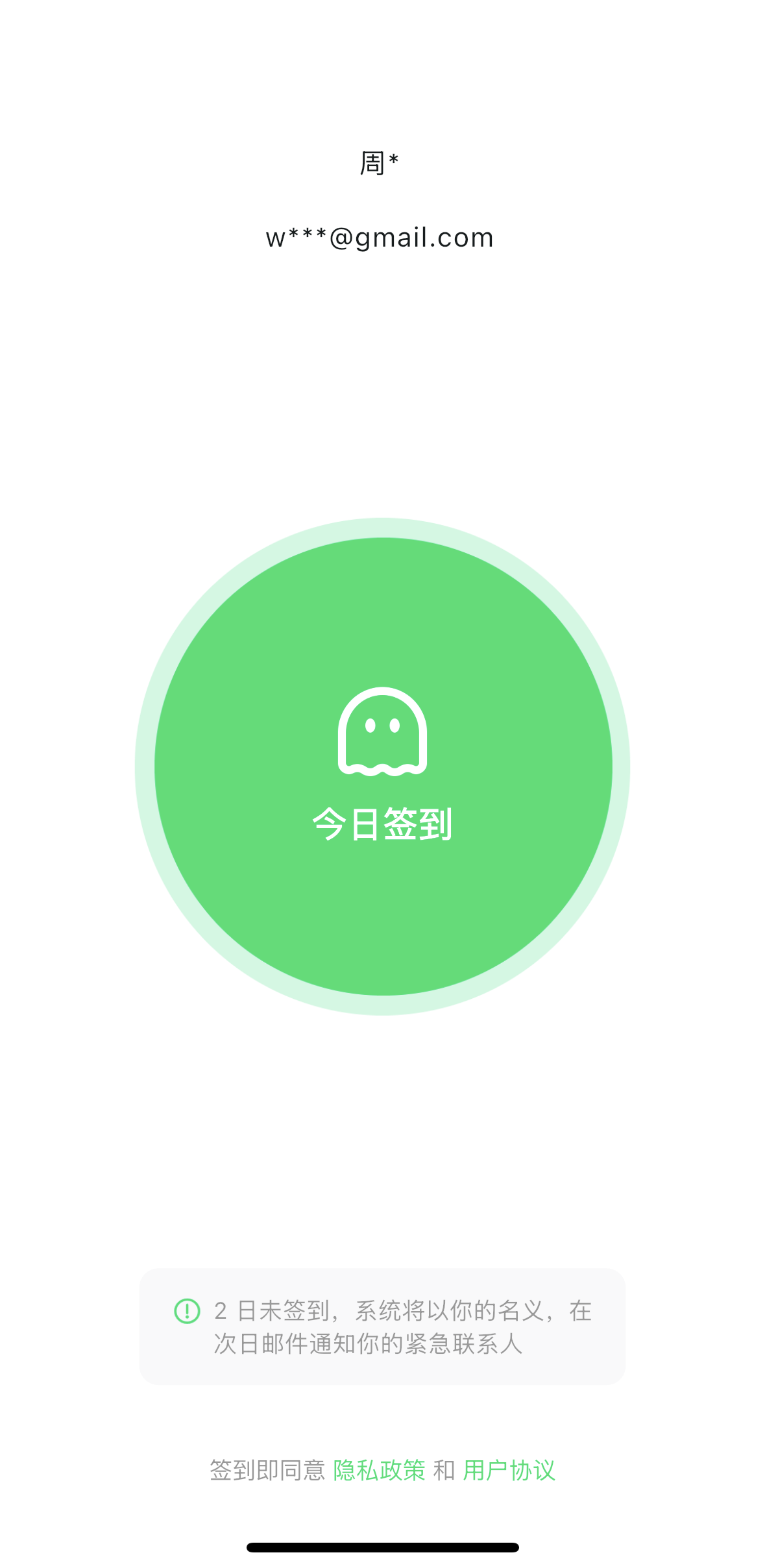 界面新闻记者下载软件发现,“死了么”App目前仅一个页面,页面中心设置了一个签到按钮。据产品介绍,填入用户名与紧急联系人邮箱地址后,若连续几日未签到,系统将自动发送邮件告知紧急联系人。