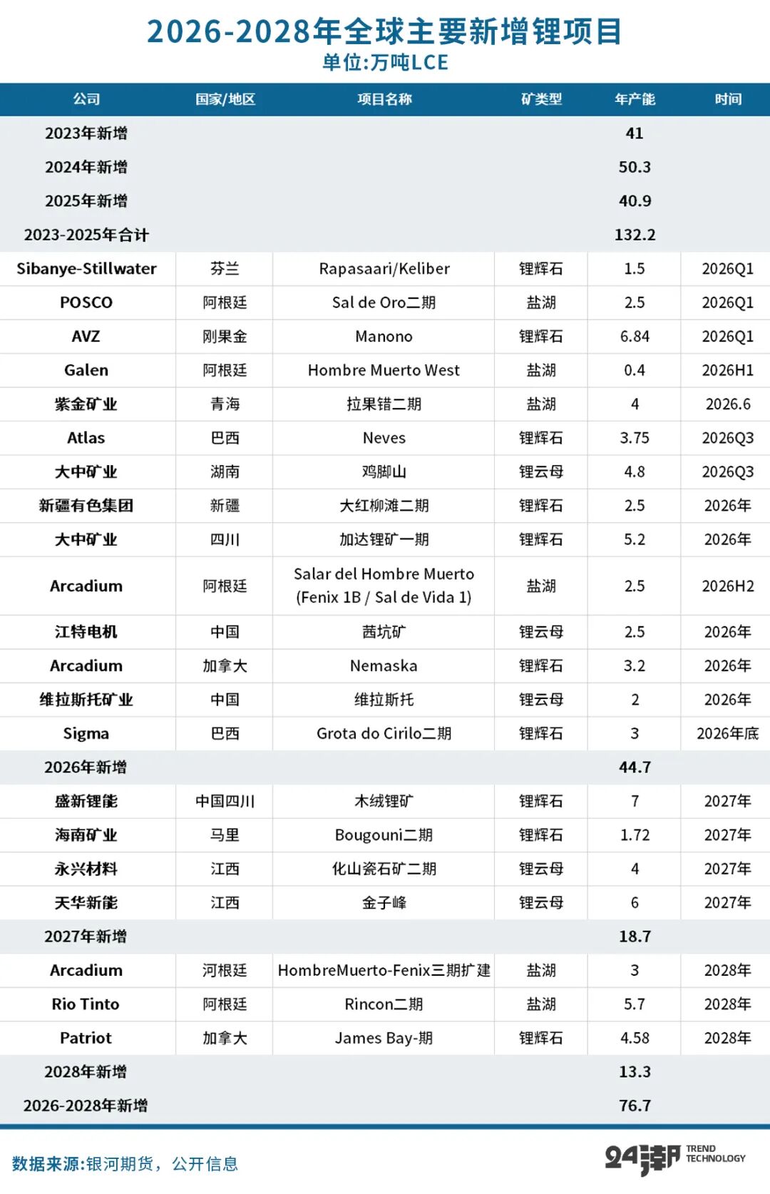 据笔者统计,2023-2025年全球锂资源新增投项目产能合计132.2万吨,主要来自国内盐湖新项目以及锂辉石投产、非洲矿,以及南美盐湖产能的爬产等。