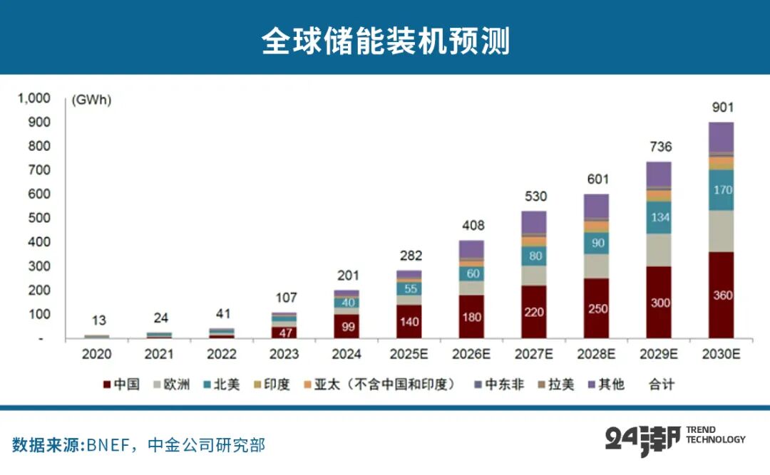 根据中金的保守估计2025/2026年国内储能装机量将达到140GWh/180GWh、同比增速41%、29%,全球装机282GWh/408GWh、同比增长41%/45%。
