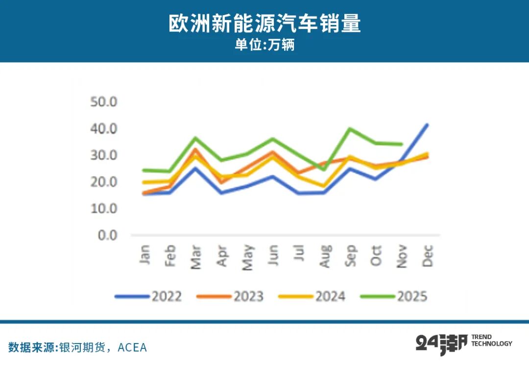 三大主流市场上,目前只有欧洲市场迎来复苏,1-10月欧洲新能源汽车累计销量309万辆,同比增长29%。