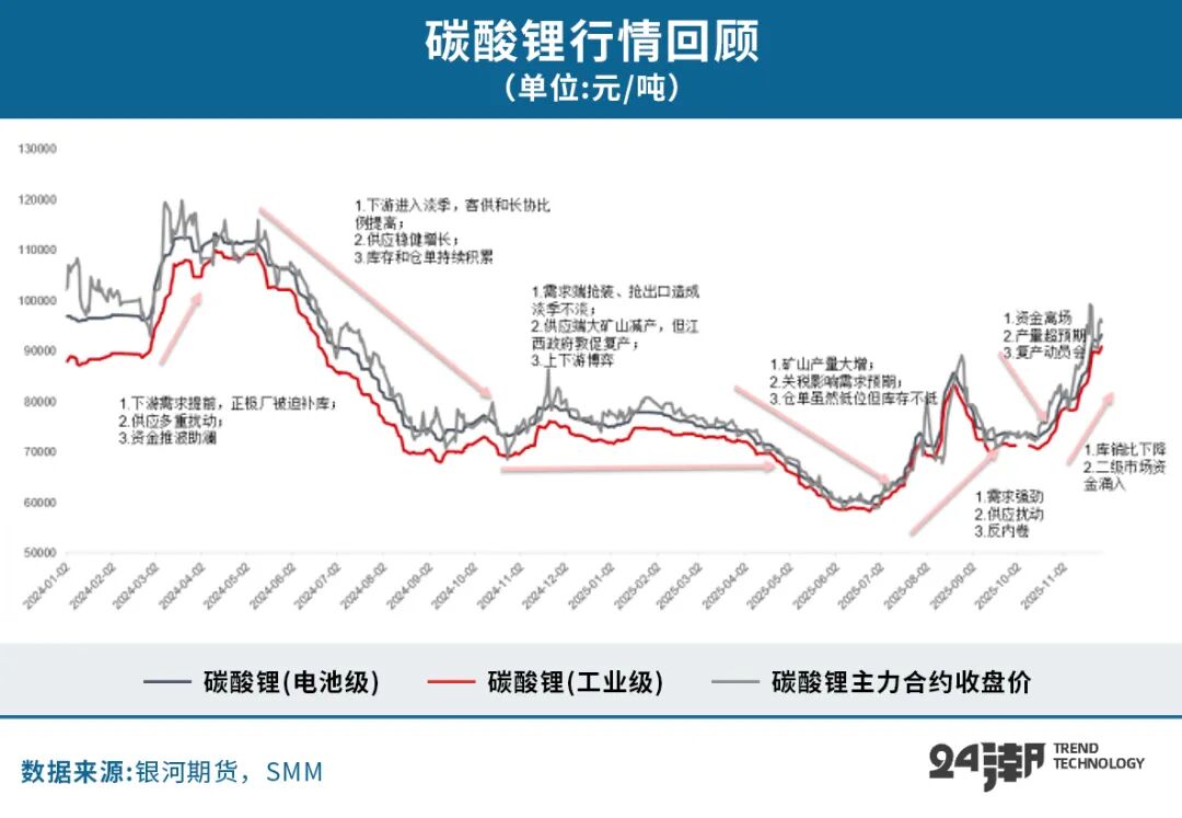 同时2025年下半年国内出现由于反内卷政策带来的部分盐湖、锂云母项目的被动减产,新能源汽车产销维持一个较好的自然增长、终端储能装机超预期高增,带来供需关系格局的转换,产业链自下而上开始去库存,碳酸锂月度供需转为短缺,价格低位反弹推动,到年底接近12万元/吨。