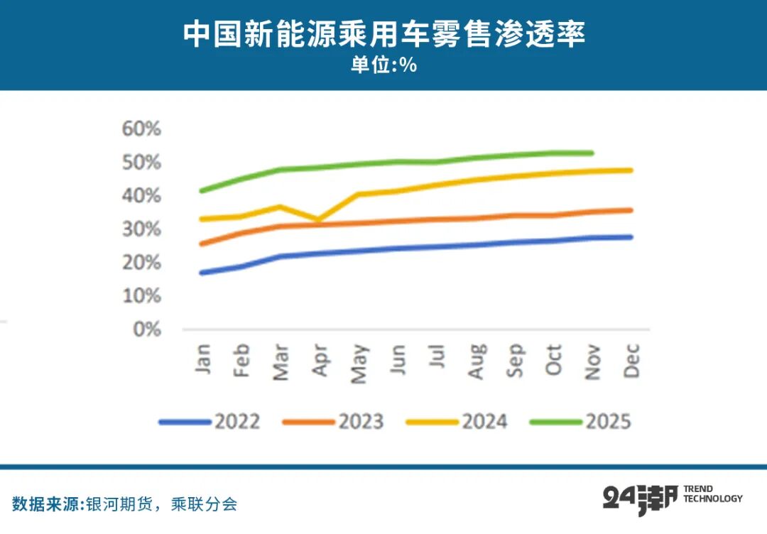 中汽协数据统计,2025年1-11月中国新能源汽车销量累计同比增长31%至1473.4万辆,11月渗透率达到53%。预计全年有望达到1655万辆,累计同比增长29%,全年渗透率有望达到48%。在当前新能源乘用车零售渗透率已超过60%的前提下,补贴若不加码,车销增速出现下滑已是大概率事情。