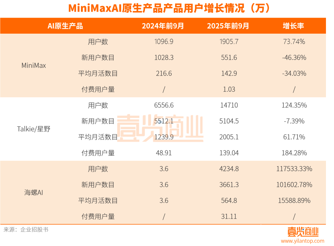 虽然MiniMax的收入大部分源于个人用户,但几个主要产品的核心用户增长指标却有了放缓的迹象。2025年前9个月,MiniMax主应用新用户数增长率同比下降46.36%,Talkie/星野新用户数增长率同比下降7.4%。