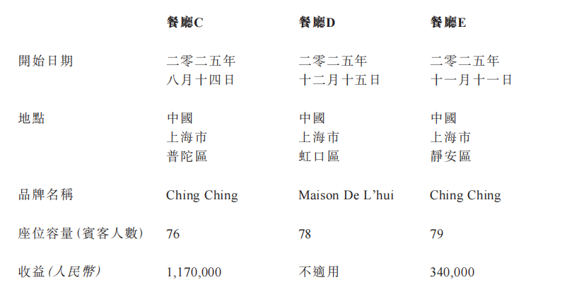 2025年下半年,上海小南国集团推出了新品牌“ChingChing”上海菜,迎合注重性价比的顾客。同时,于2025年12月15日重开Maison DeL’hui,主打本帮菜和粤菜,以融合中西烹饪理念和精致用餐体验为特色,人均消费在500元左右,迎合高消费力顾客。据上述交易公告,截至2025年11月30日,两家ChingChing餐厅总共带来了151万元收益。