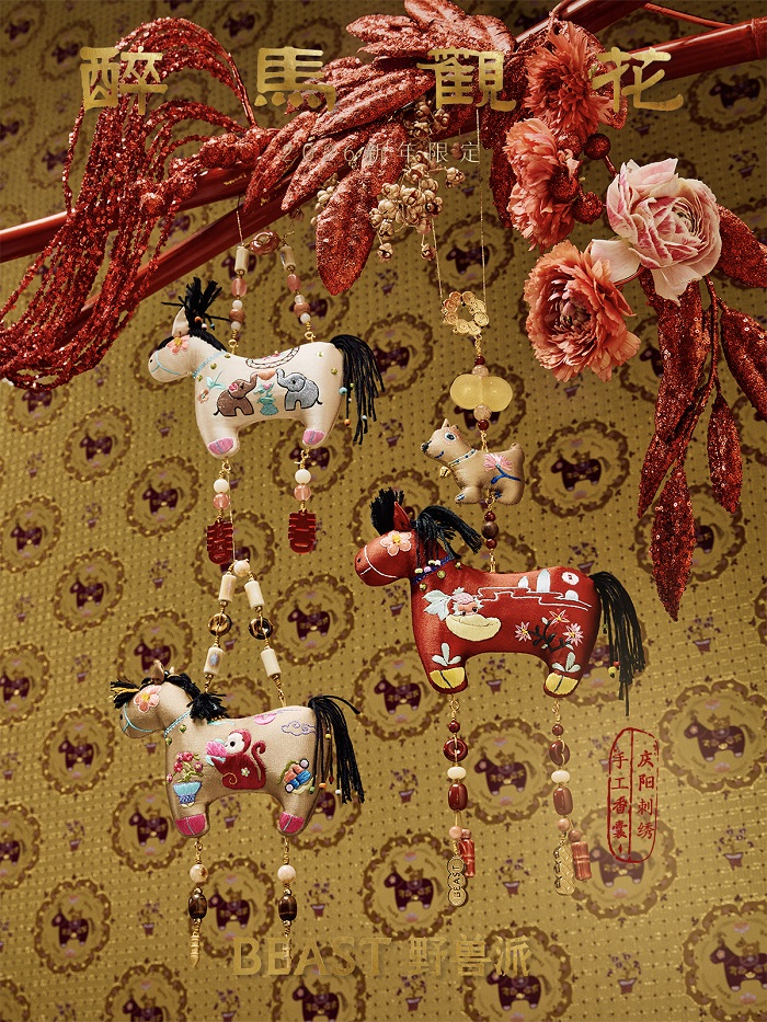 不同于传统拍摄现场,野兽派的马年大片更像一场正在发生的新春准备:朱扉开启,灯火渐明,针线、剪纸与彩珠依次铺开,年意在手作之间慢慢成形。三位艺人分别参与不同工艺体验,各自留下属于马年的一笔。