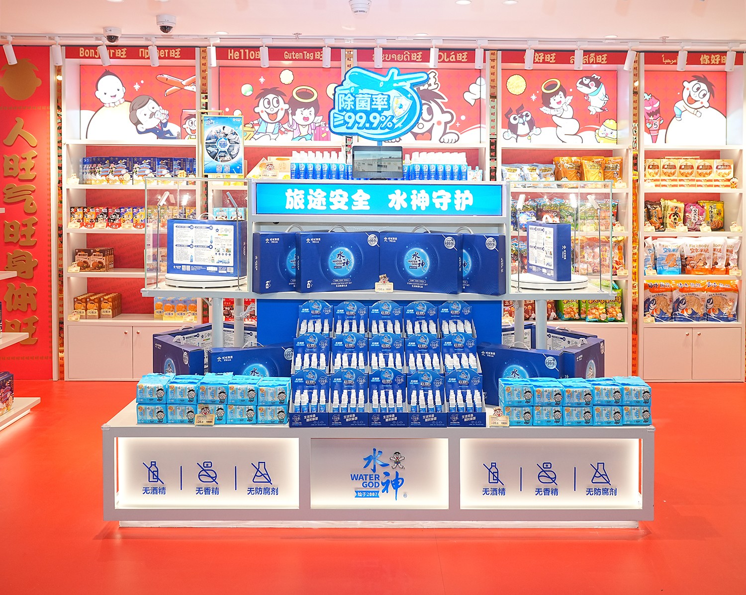 旺旺集团在上海浦东国际机场落地首家「你好旺」IP主题门店,店内特别设立水神用品专区,为旅客提供更适合出行场景的消毒解决方案。