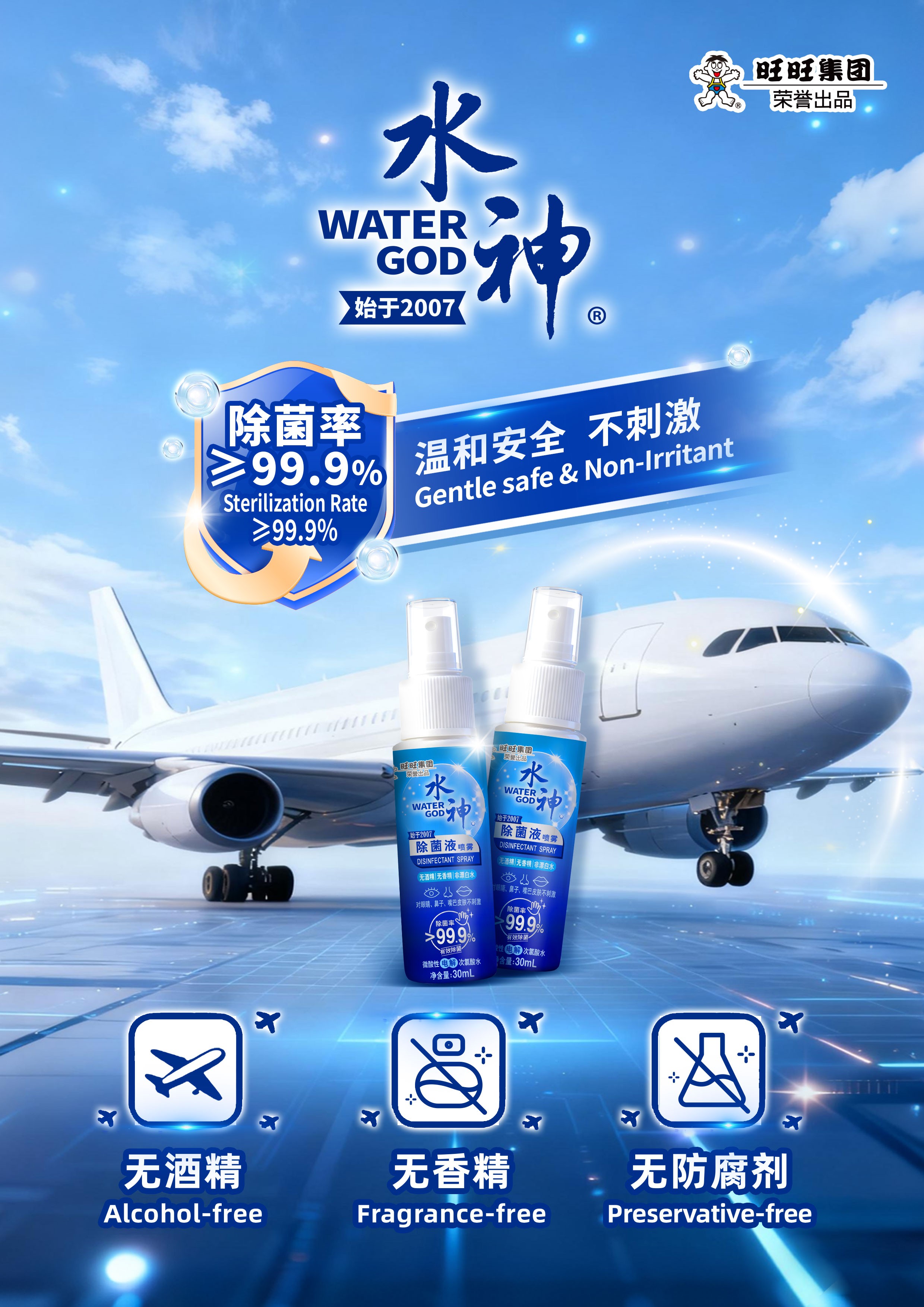 水神产品的核心成分为次氯酸。作为一种无酒精、无毒、无残留的安全型消毒成分,次氯酸已被证实可有效杀灭多种病毒和细菌,同时不属于危险化学品。这也意味着,旅客可在安检后自由购买水神产品,并安心带上飞机,实现从机场到落地的全旅程防护。