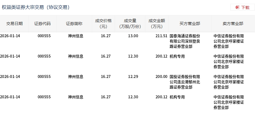 1月14日,神州信息大宗交易成交49.89万股,成交额811.75万元,占当日总成交额的0.37%,成交价16.27元,较市场收盘价18.69元折价12.95%。