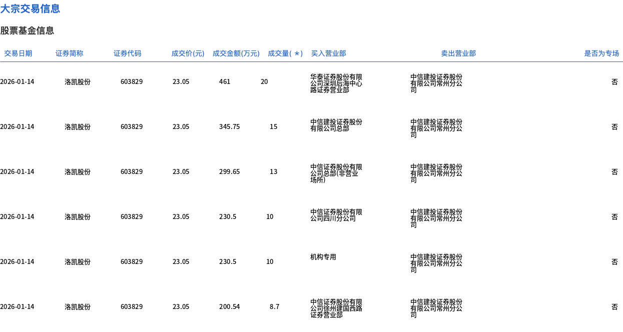 1月14日,洛凯股份大宗交易成交76.7万股,成交额1767.94万元,占当日总成交额的3.39%,成交价23.05元,较市场收盘价26.49元折价12.99%。