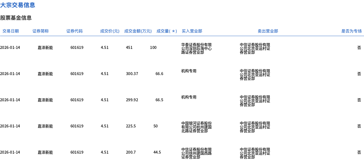 1月14日,嘉泽新能大宗交易成交527.6万股,成交额2379.49万元,占当日总成交额的3.64%,成交价4.51元,较市场收盘价5元折价9.8%。