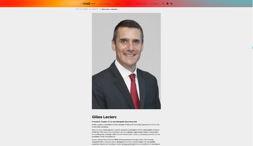 小食代还留意到,可口可乐公司官网高管介绍栏目中,吉路克(Gilles Leclerc)仍然在列,其职务还是显示为可口可乐公司大中华及蒙古区总裁。