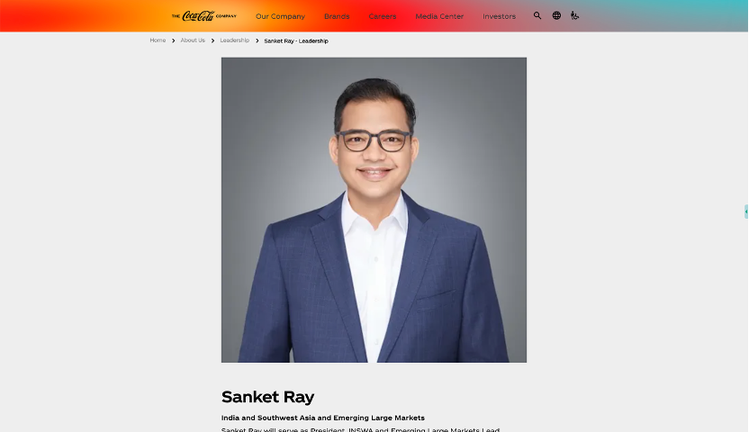 在今晚任命后,小食代留意到,可口可乐公司全球官网已经“火速”更新。其中,睿胜辉的介绍专页已经加入了上述新职务。专页指出,睿胜辉是于2004年加入公司,并于2020年被任命为INSWA业务单元的总裁。