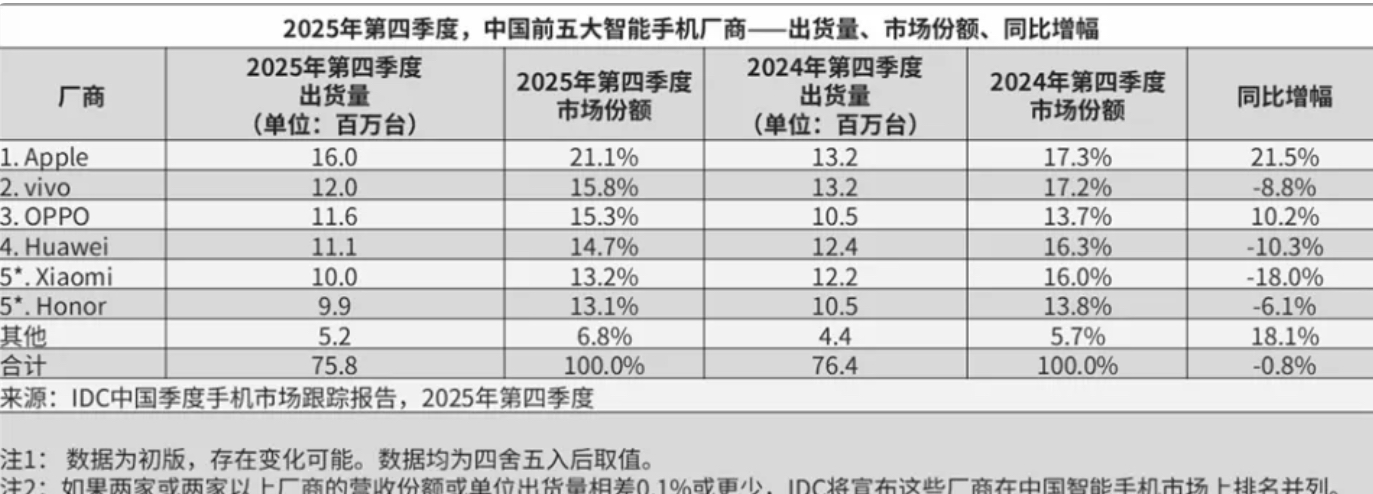 其中,2025年第四季度出货7578万台,同比下降0.8%,整体表现平稳。第四季度苹果、vivo、OPPO 位列出货量前三;苹果以1600万台出货量、21.1%市场份额位居榜首,同比增幅达21.5%;vivo、OPPO紧随其后,小米则同比下滑18.0%。