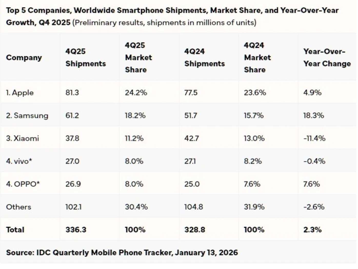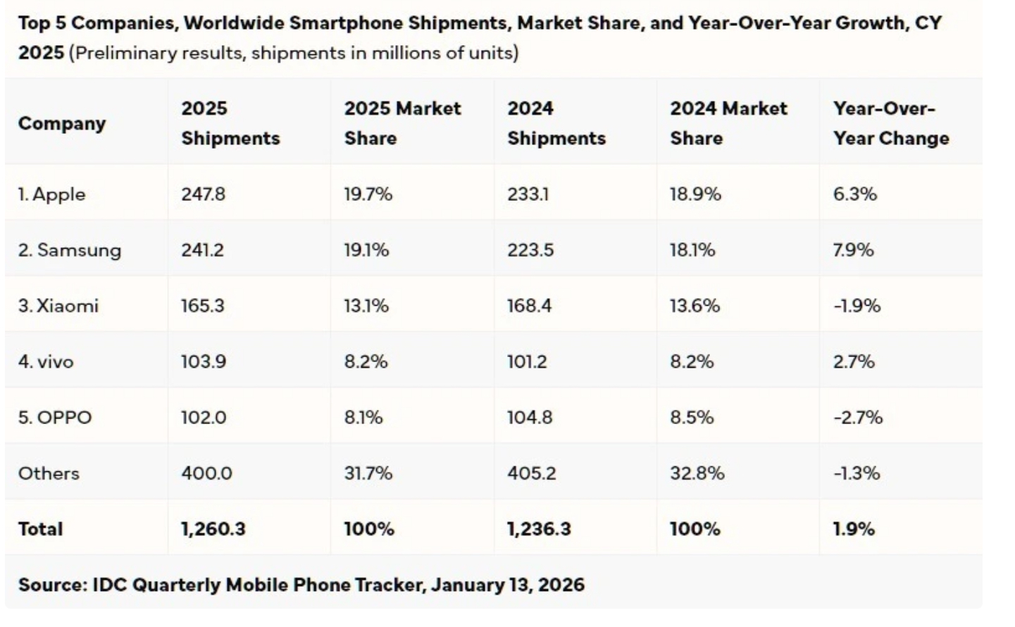 1月14日,市场研究机构IDC发布《全球季度手机跟踪报告》初步数据。