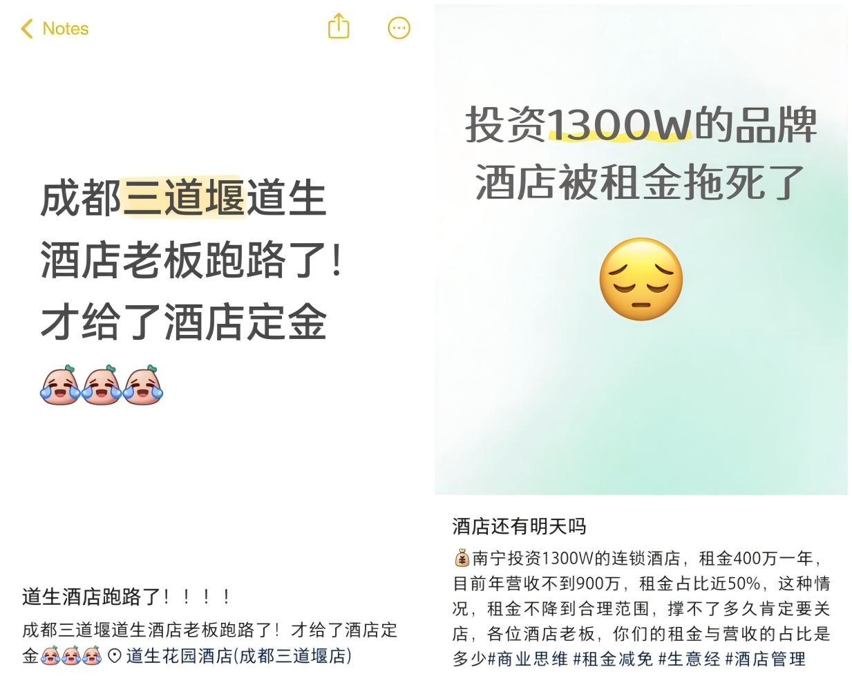 在成都、长沙、南宁等地,有不少酒店老板扛不住租金压力,索性放弃门店,变卖设备,一走了之。