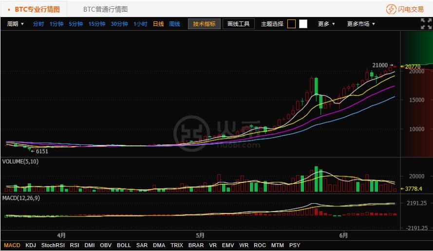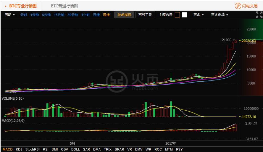 看火币网比特币行情周线图。火币网比特币价格已经连续上涨11周,上周直接突破前期长上影线高点19084元,强势特征明显。看火币网比特币行情日线图。均线呈现多头发散态势尚没有改变,币价沿MA5持续向上,每日涨幅均不是很大,且成交量较小,表明筹码锁定平稳,投资者预期基本一致,没有大幅的抛压盘。但同时需要注意的是,该情形一旦出现恐慌下跌,跌幅往往较大。火币网温馨提示:投资有风险,入市需谨慎。