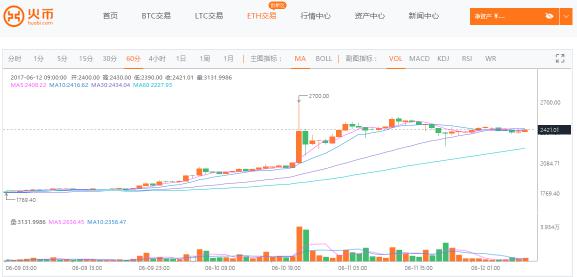 看火币网以太坊行情小时图。6月9日晚间,火币网以太坊价格再次创出历史新高,破前期高点1858.7元,后续连续小幅上涨,直至6月10日晚间,火币网以太坊价格突然爆量上涨,一小时内从2000元天量涨至2700元,涨幅一度超过30%。后因投资者多空分歧,回落至2400元附近,放量创出短期高点后产生高位强压力位。现火币网以太坊价格缩量高位进行盘整,等待方向选择。火币网温馨提示:以太坊自今年初尚未经历大幅调整,敬请注意风险。