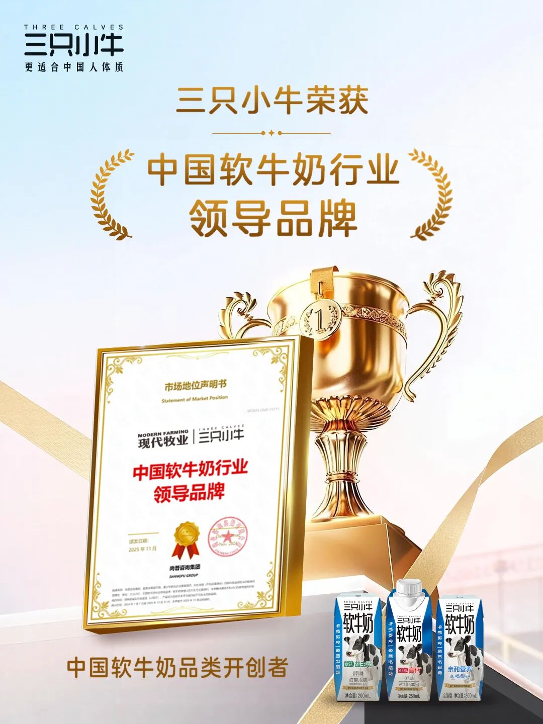 也正因为在软牛奶品类的技术突破与市场教育上的关键作用,2025年11月,三只小牛被尚普咨询集团授予了“中国软牛奶行业领导品牌”认证,标志着行业对其价值的高度认可。