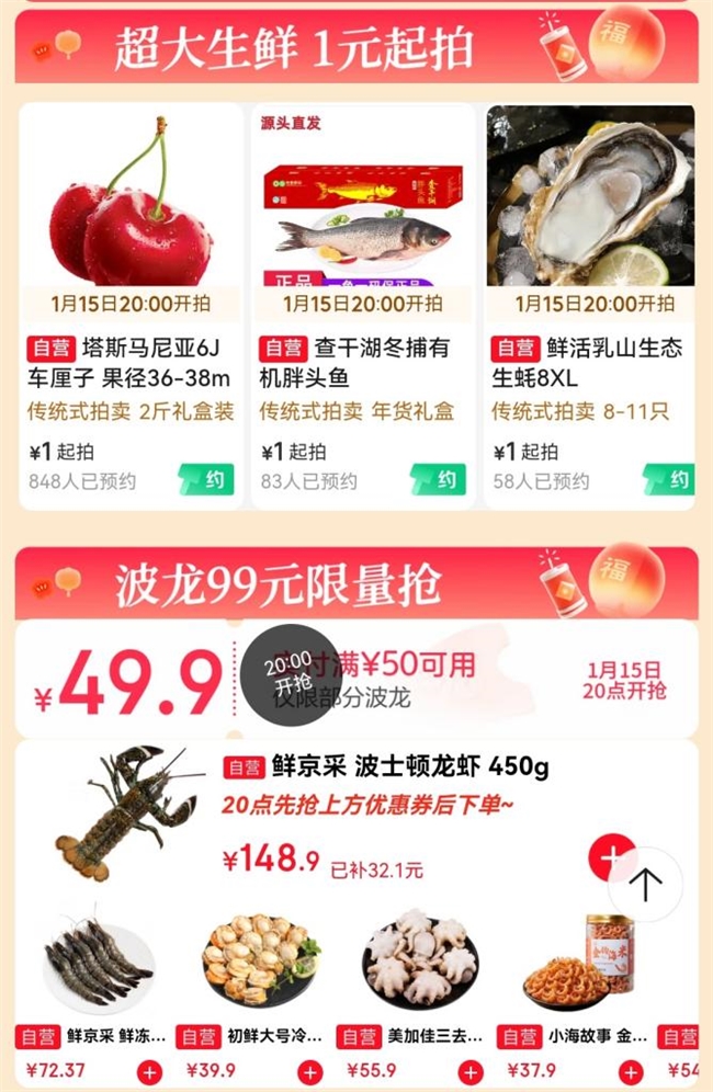随着春节脚步临近,置办年货开始成为许多家庭的“头等大事”。1月15日晚8点,京东新年购物季生鲜主推日火热开启,围绕“送心意礼,过鲜活年”的主题,推出“满99享8折、满199打6折”等惊喜优惠,此外还可叠加“满200减20元”优惠券,多款爆款生鲜直接低至5折。此外,6J大的超级巨无霸车厘子、单条40-50斤重的查干湖冬捕有机胖头鱼、单只10斤重的澳洲特大皇帝蟹等,只需1元即可参与起拍。不仅如此,消费者下单,还有机会参与“千元生鲜年货大礼包”抽奖活动,轻松实现“年货生鲜自由”。