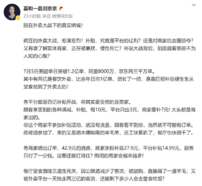 嘉和一品创始人刘京京公开表示:商家不参加补贴活动就没有流量,而参加则面临赔本赚吆喝。