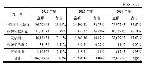 招股书表明,科锐国际主营业务有三:灵活用工、招聘流程外包、中高端人才寻访。2014年—2016年,三者营收占总营收分别为99%、96.38%、96.05%。值得注意的是,科锐国际最赚钱的并不是最让人熟知的猎头业务,而是招聘流程外包及灵活用工业务。