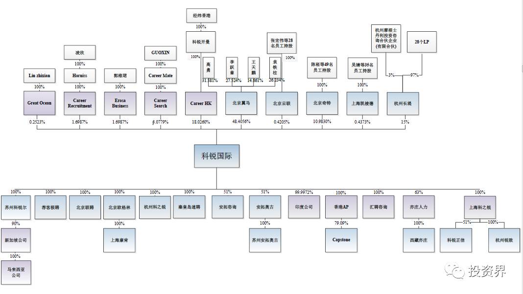通过查阅招股书,可以发现科锐国际有着非常复杂的股权架构,仅子公司就有21家——13 家一级控股子公司和8家二级控股子公司,此外有4家参股公司。