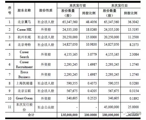科锐国际前身为1996年9月高勇、陆俊武各出资5万元设立的北京翼马。经历21年的发展和一系列的股权演变,在发行前,科锐国际股权结构如下: