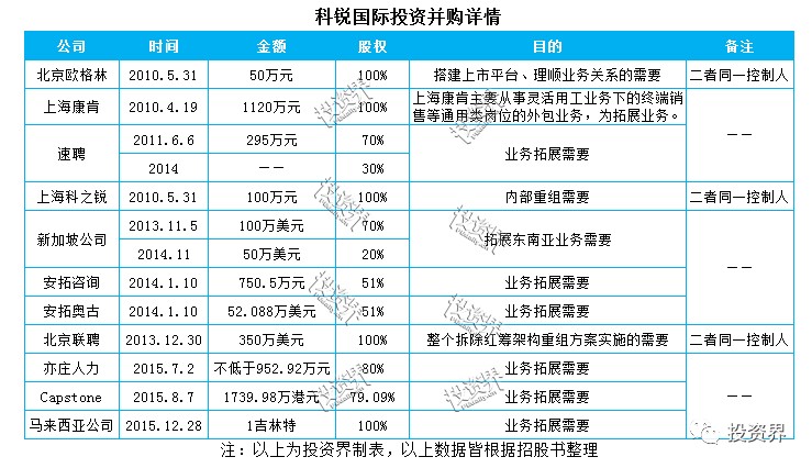 据新京报此前的报道显示,一位投资人士分析说,科锐国际属于轻资产公司,上市融资可以减轻其流动资金压力;过去的并购经历,以及招股书中规划的发展战略,都显示出科锐国际通过并购扩张业务的意图,“通过上市,公司可以获得融资,还可以通过股票并购”。