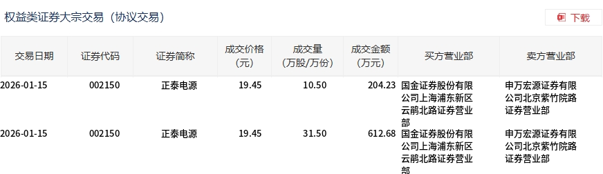 1月15日,正泰电源大宗交易成交42万股,成交额816.91万元,占当日总成交额的1.75%,成交价19.45元,较市场收盘价21.37元折价8.98%。