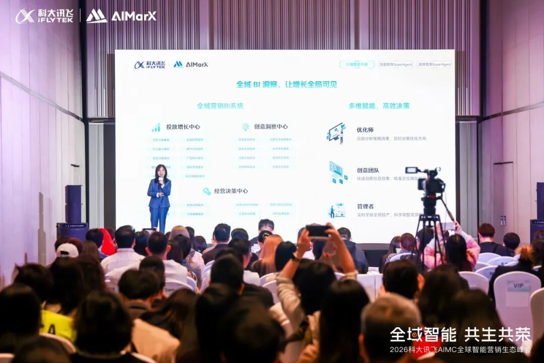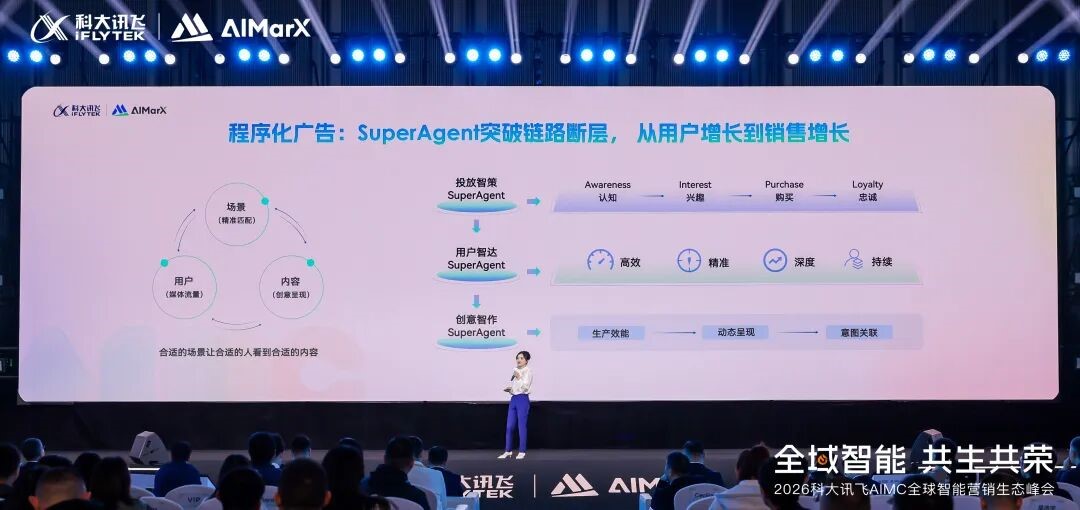 当AI与营销持续深度融合,“SuperAgent”正作为营销增长的核心引擎,引领全球营销生态变革。1月15日,2026科大讯飞AIMC智能营销生态峰会在深圳盛大启幕,在这场集合科大讯飞生态伙伴的创新盛会上,讯飞AI营销(AIMarX)提出营销SuperAgent的应用框架,并重磅发布基于SuperAgent构建的营销智能体平台,通过平行分论坛深度对话全球伙伴,以生态展区全景呈现智能营销新生态,全面勾勒出SuperAgent驱动营销关系革新与价值重塑的共生共荣新图景。