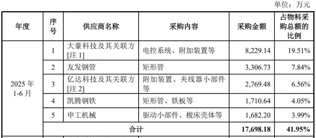 此后,双方合作不断扩大。《招股书》显示,信胜科技2022年—2024年及2025年上半年分别向申工机械采购驱动小部件、梭床壳体、针杆架等576.34万元、780.04万元、1602.56万元和1682.2万元,申工机械由此在2025年上半年新进成为信胜科技的第五大供应商,采购占比为3.99%。