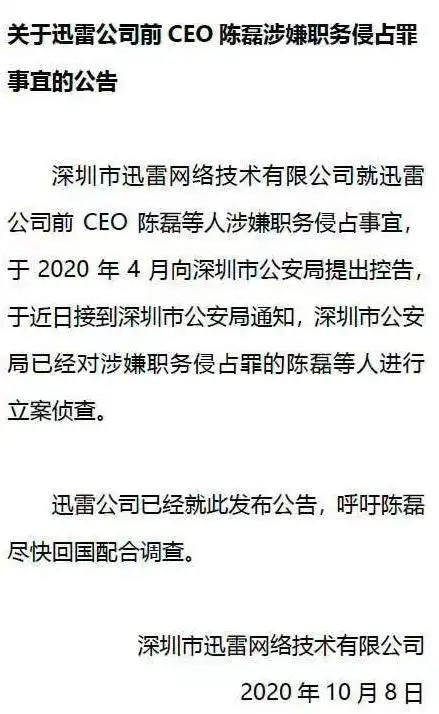 2020年4月陈磊被罢免后,随即与董鳕出境并长期滞留境外。迅雷随后报案称其涉嫌职务侵占,虽被立案侦查,但因陈磊拒不配合,刑事程序无法推进,最终案件被撤销。
