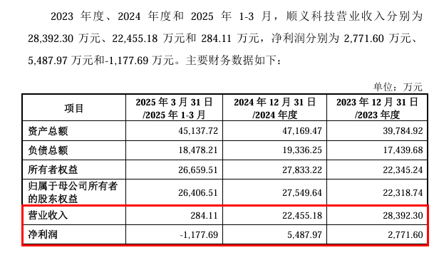 尽管北方长龙暂未披露收购标的的业绩,但根据慈星股份此前披露的数据,顺义科技2023年度、2024年度和2025年1-3月,顺义科技营业收入分别为28392.30万元、22455.18万元和284.11万元,净利润分别为2771.60万元、5487.97万元和-1177.69万元。