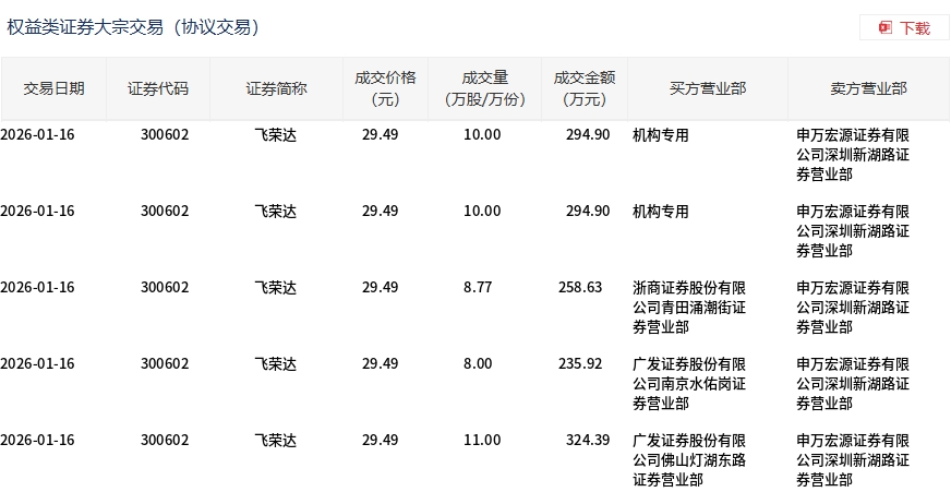 1月16日,飞荣达大宗交易成交47.77万股,成交额1408.74万元,占当日总成交额的1.77%,成交价29.49元,较市场收盘价33.05元折价10.77%。
