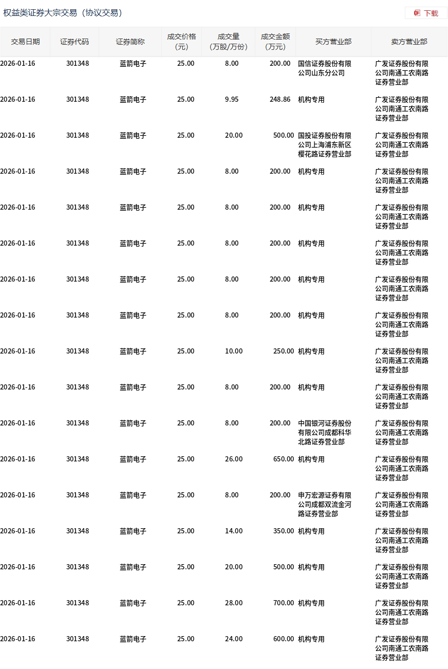 1月16日,蓝箭电子大宗交易成交223.95万股,成交额5598.86万元,占当日总成交额的1.95%,成交价25元,较市场收盘价34.37元折价27.26%。